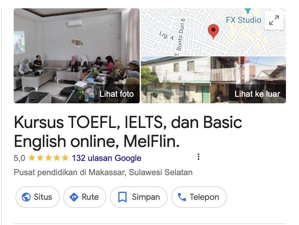 Kami mendapatkan rating 5,0 di google maps dengan ratusan ulasan positif dari alumni kami yang telah mengambil kelas kami.